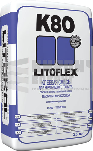 LITOFLEX K80 eco универсальный клей с широким диапазоном применения: облицовка стен и полов, как при внутренних, так и при наружных работах, а также для облицовки балконов, террас,лестниц, фасадов. LITOFLEX K80 eco предназначен для укладки керамогранита, керамической плитки, клинкера, натурального камня с устойчивой структурой, как на стабильные основания, так и на основания подверженные деформации, в том числе и методом укладки «плитка на плитку».